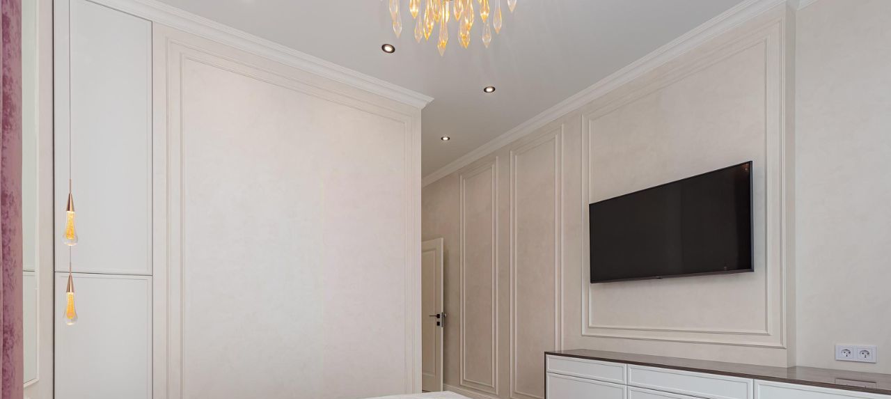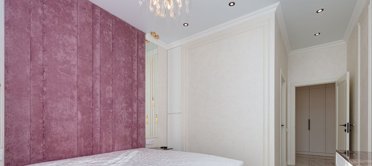 Спальная комната со своей гардеробной, большой двухспальной кроватью.