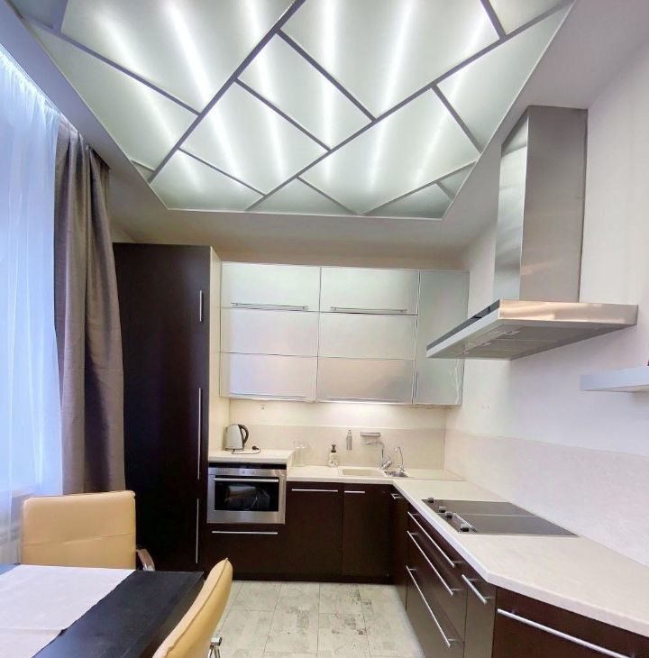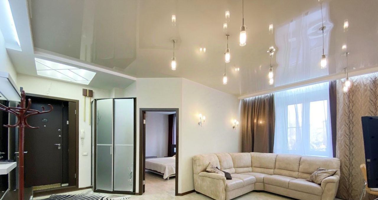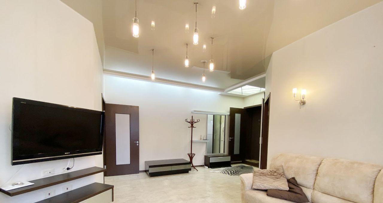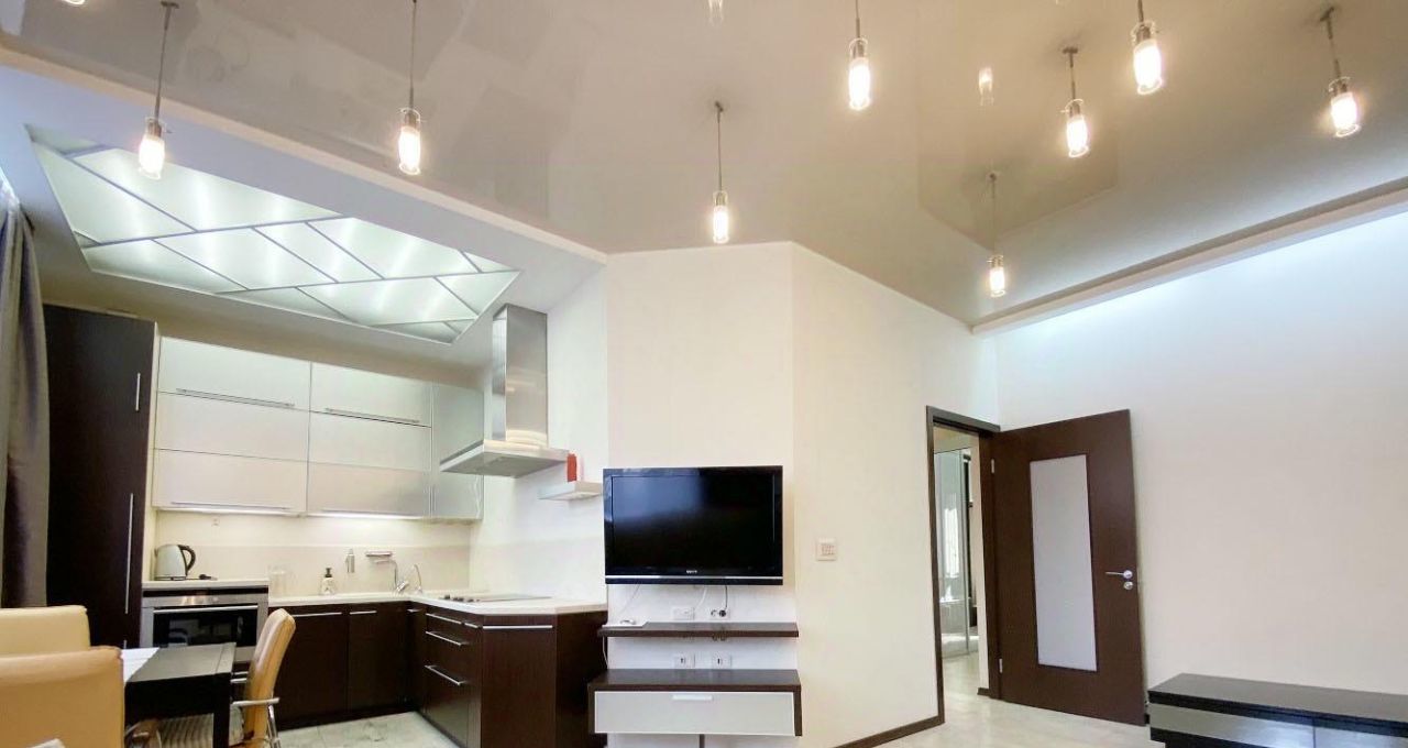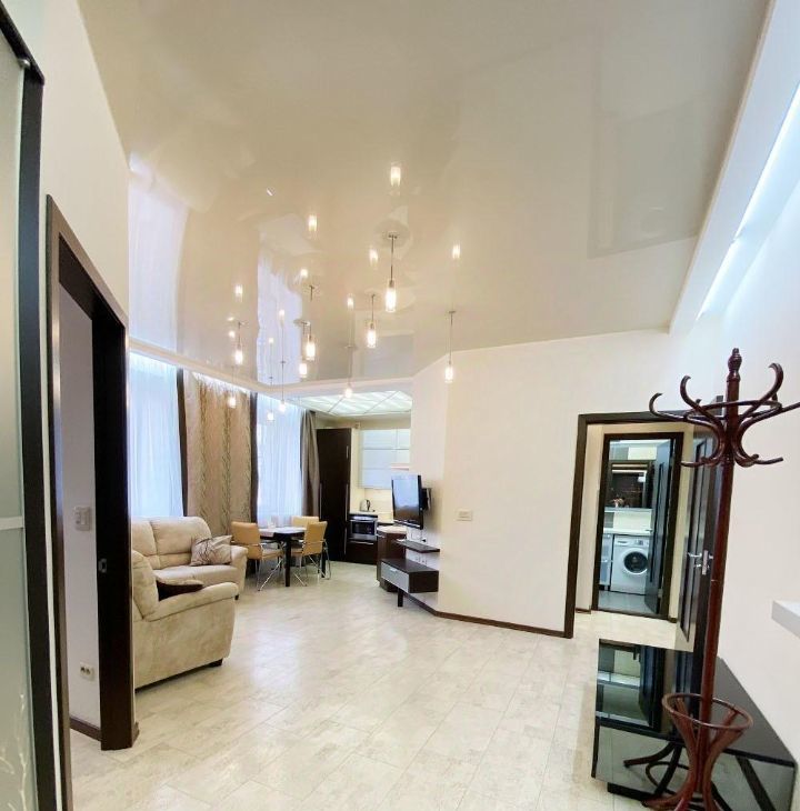 Высокие потолки. Разноуровневое освещение. Пробковое покрытие на полу.