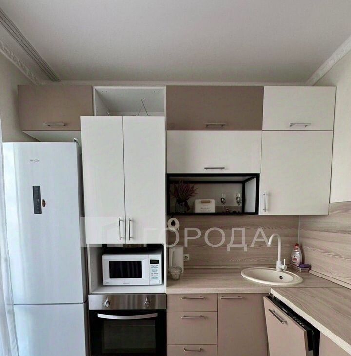 Кухня: гарнитур вместительный, сделан под высокий рост, диванчик, стол, 3 стула, посудомоечная машина, варочная панель, вытяжка, духовой шкаф, микроволновая печь, холодильник высокий 2 м, чайник.
