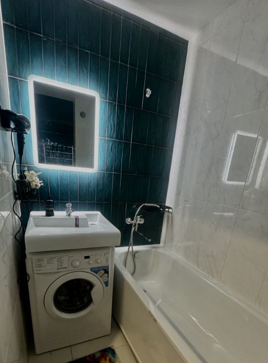 В квартире есть все необходимое для комфортного проживания: современная мебель на кухне и в комнате, а также необходимая техника, включая холодильник, телевизор и стиральную машину. Ванная комната оборудована ванной, что идеально подходит для отдыха после долгого дня. Из окон открывается вид на улицу, а также имеется балкон, где можно наслаждаться свежим воздухом.