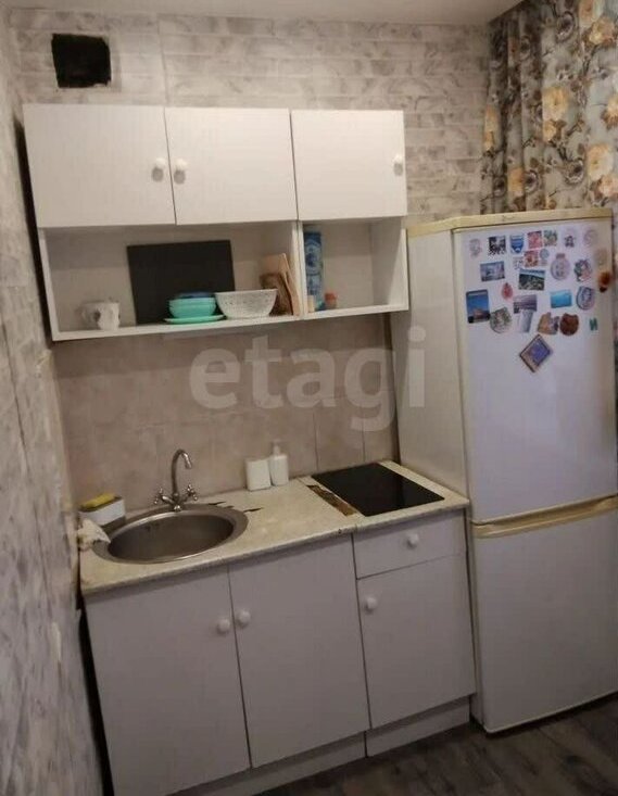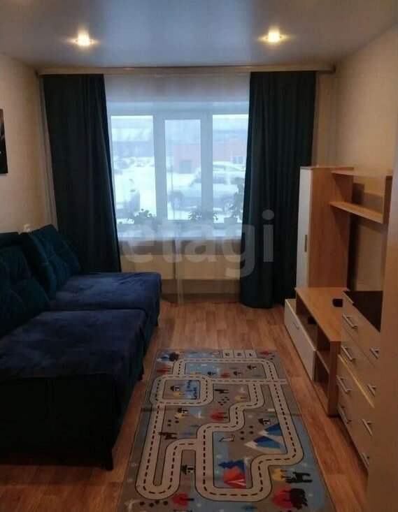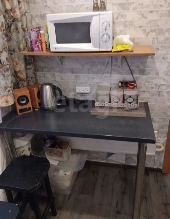 В гостиной установлен диван и телевизор, а также имеется рабочий стол. Из мебели также присутствуют шкафы. Кухня оборудована необходимой техникой: холодильник, микроволновая печь и стиральная машина.
