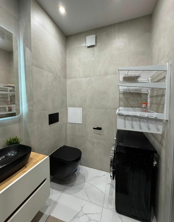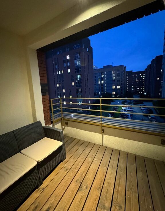 В квартире есть всё необходимое для проживания: шкаф, кровать двуспальная, диван (раскладывается), встроенная микроволновка, посудомоечная машина, варочная панель, встроенный холодильник, проточный водонагреватель, теплый пол в ванной. Квартира с балконом-террасой, где есть диван и освещение.