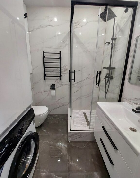 - Из техники: 2 кондиционера, посудомоечная машина, телевизор, холодильник, стиральная машина, электроплита, встроенная микроволновка и духовая печь;