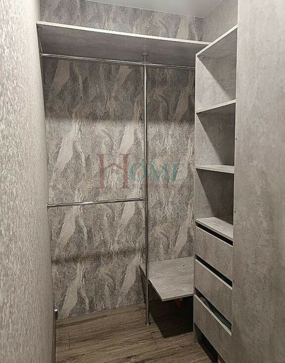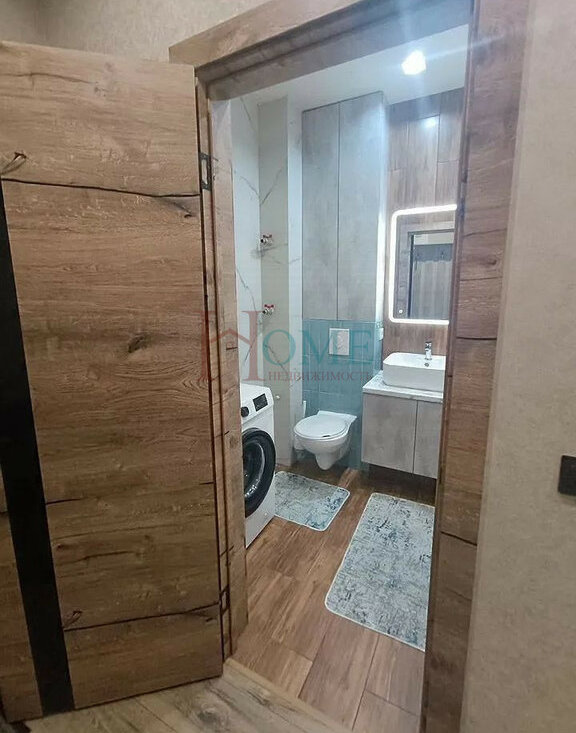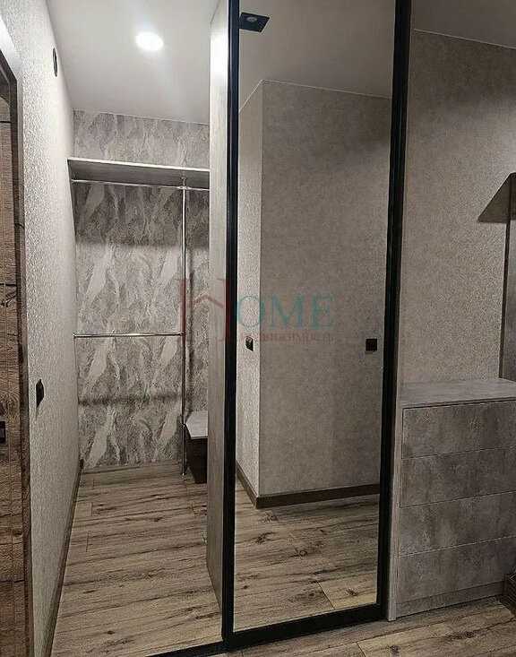 Санузел совмещенный, оборудован ванной и стиральной машиной. Лоджия застеклена, что позволяет использовать ее как дополнительное пространство. В квартире есть гардеробная комната и шкаф-купе.