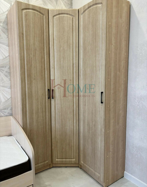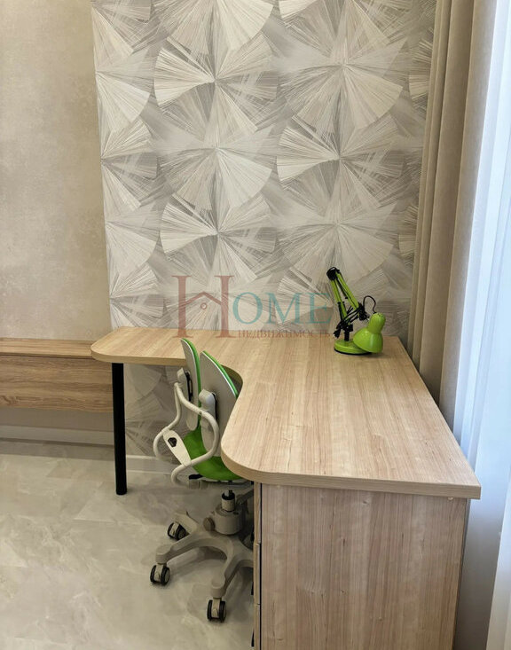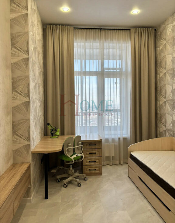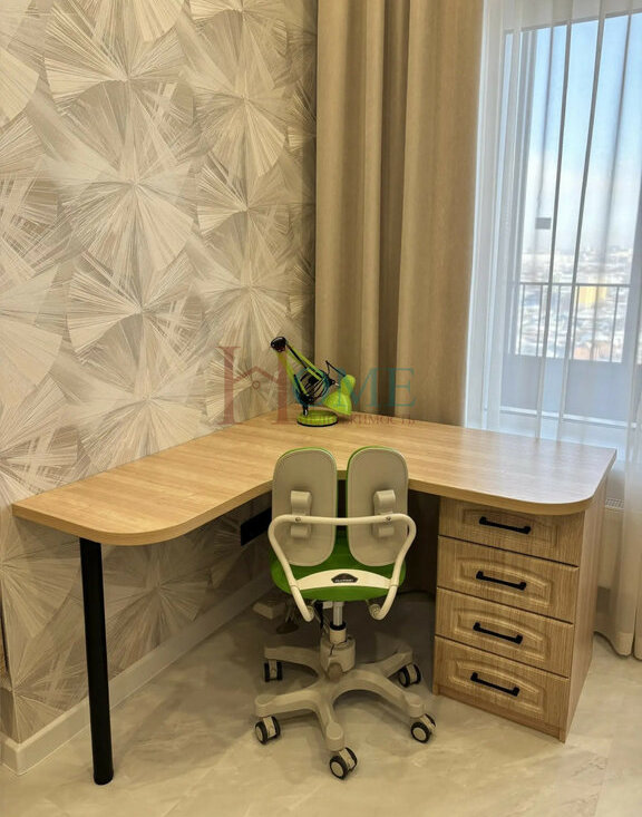 Детская комната предполагает проживание ребёнка-школьника: удобно у окна расположен письменный стол с удобным креслом, кровать, шкаф для вещей - всё самое необходимое.