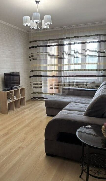 В просторной гостиной расположен раскладной диван, который идеально подойдет для размещения гостей. Также в этой комнате имеется телевизионная зона с тумбой и телевизором, а также вместительный шкаф для хранения вещей.