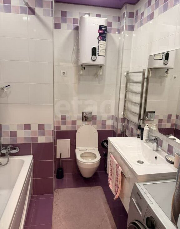 Ванная комната совмещенная, оформлена в современном стиле с использованием ярких акцентов. Из окон открывается приятный вид на городскую панораму.