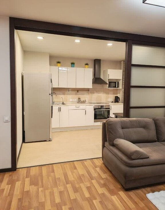 Уютная тёплая двушка-студия - совмещенная комната-кухня плюс комната с гардеробом (спальня):