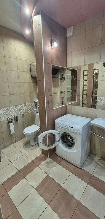 Санузел совмещенный, оснащен ванной и стиральной машиной. Лоджия застеклена, что позволяет использовать ее круглый год.