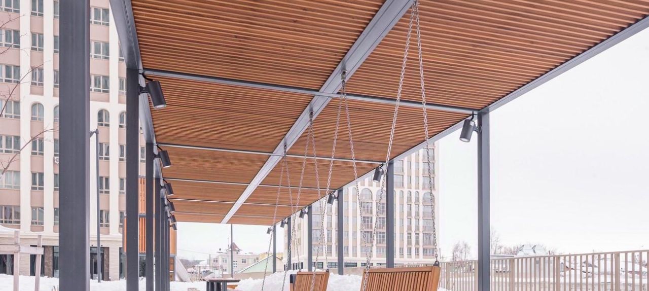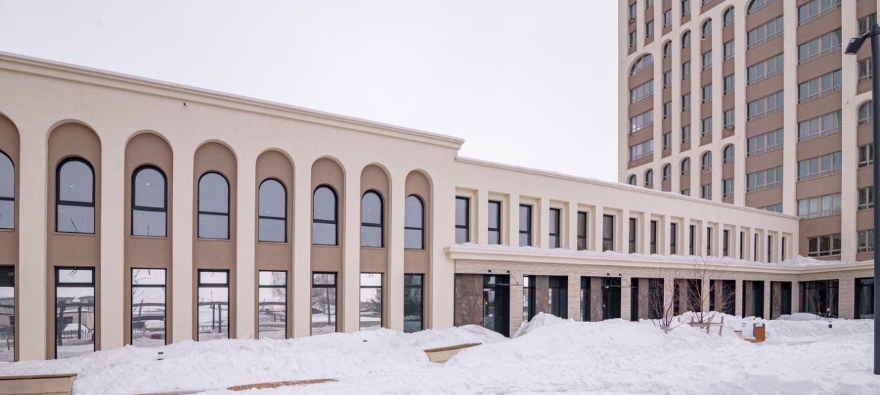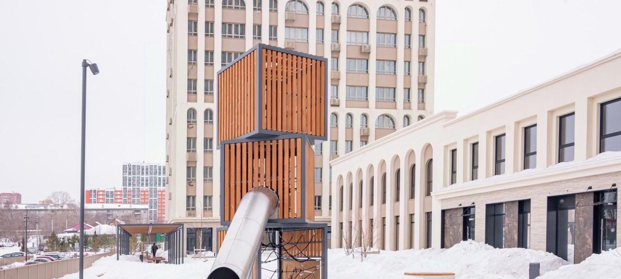 Инфраструктура: Закрытый двор, охрана, видеонаблюдение, современная детская площадка, воркаут, лаунж-зона. На первых этажах — ТЦ Service Hub (фитнес, супермаркет, аптека, кофейня).
