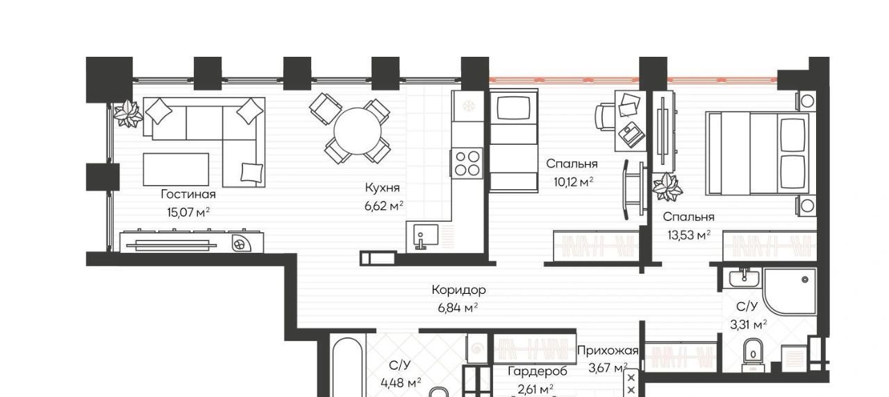 мастер спальня со своим сан узлом, гардеробная в прихожей, большая кухня-гостинная.