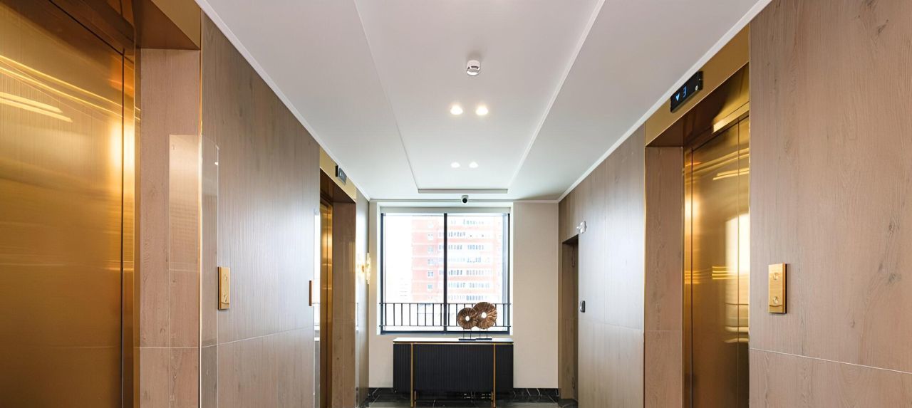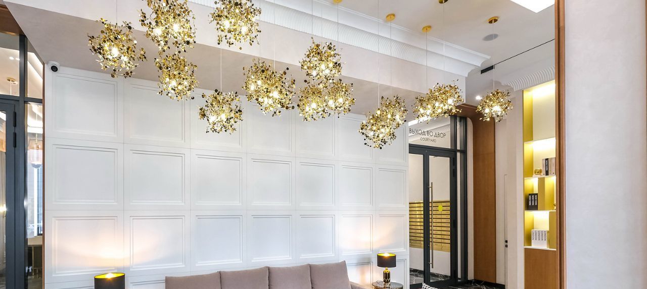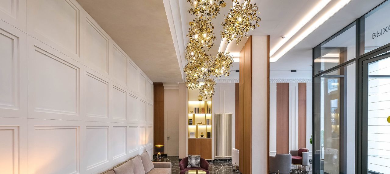 Монументальные входные группы выполнены со свето-прозрачными дверями. В холле организовано уютное лобби с мягкой зоной и камином. В отделке использованы натуральные материалы — камень, дерево, металл и много стекла. Гостей и жителей комплекса встречает консьерж на стойке ресепшн. Первые 3 этажа занимают коммерческие площади для бизнеса. На подземном этаже для удобства жильцов запроектированы кладовые помещения. Для связи между этажами в каждом корпусе установлено по 4 лифта. Специфика жилого комплекса отвечает всем современным требованиям к комфортности и безопасности проживания.