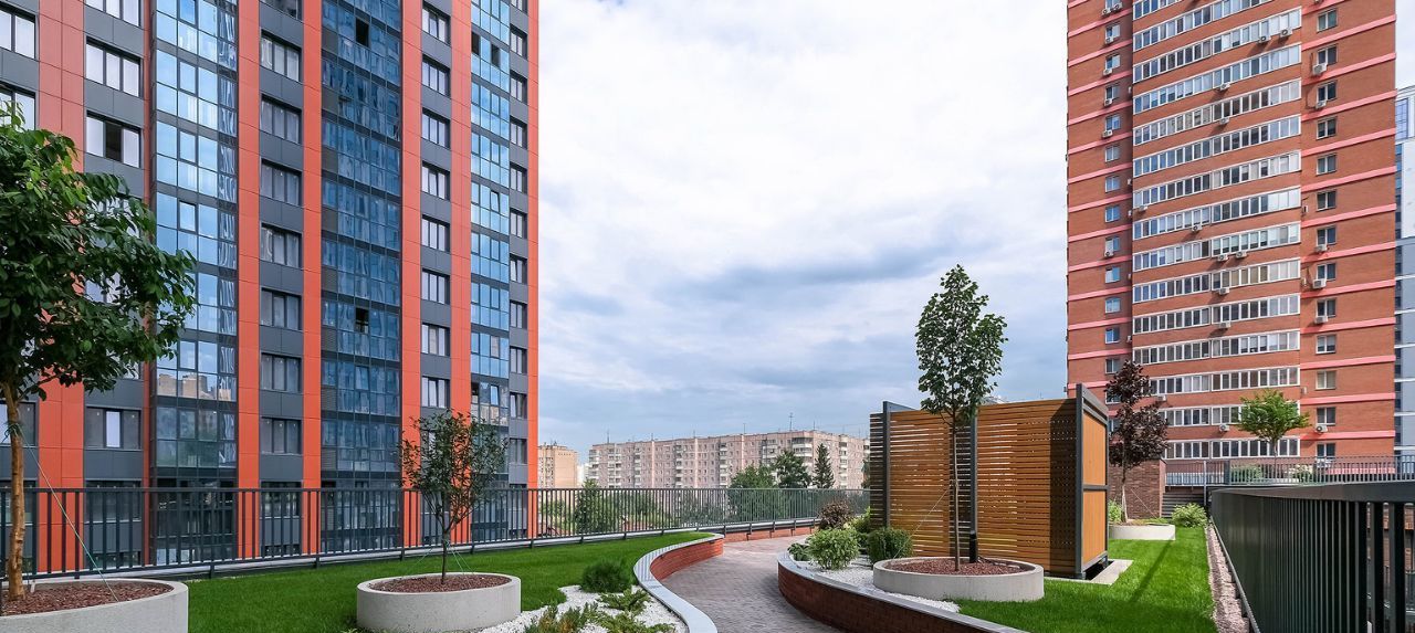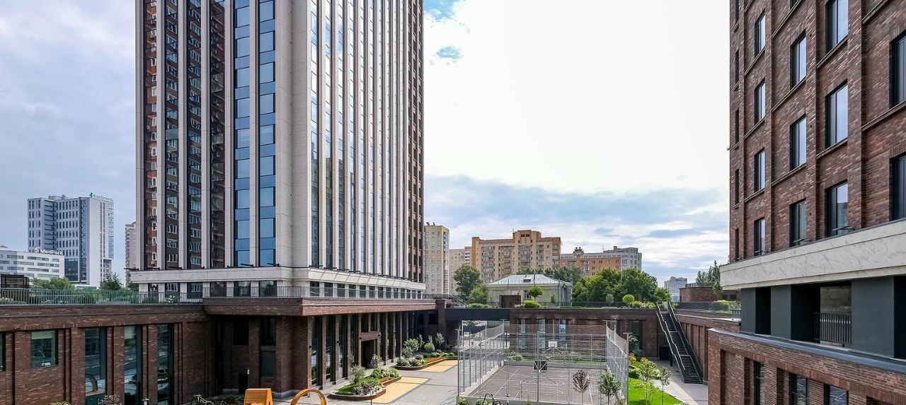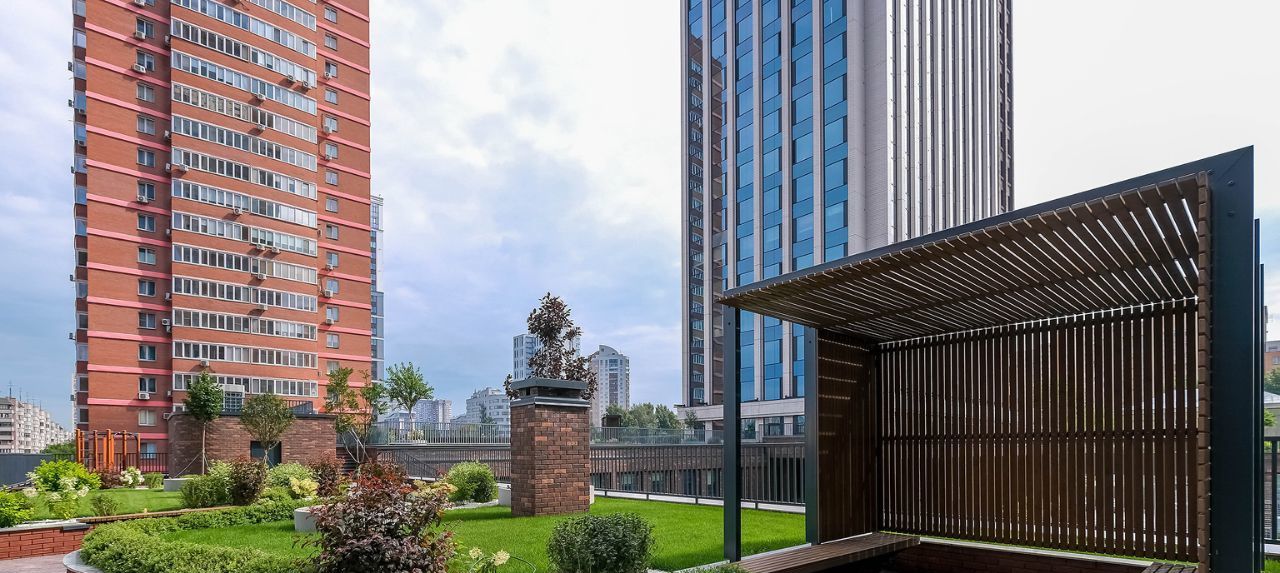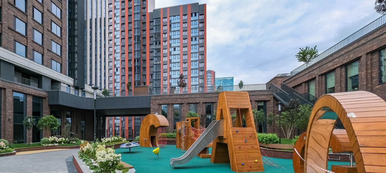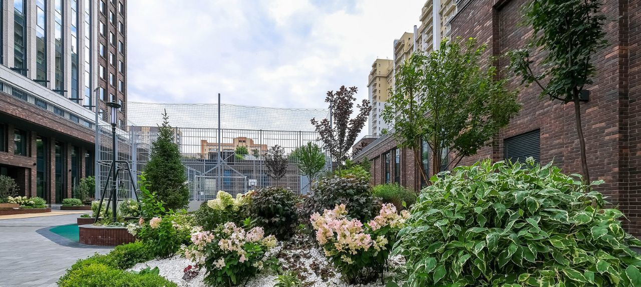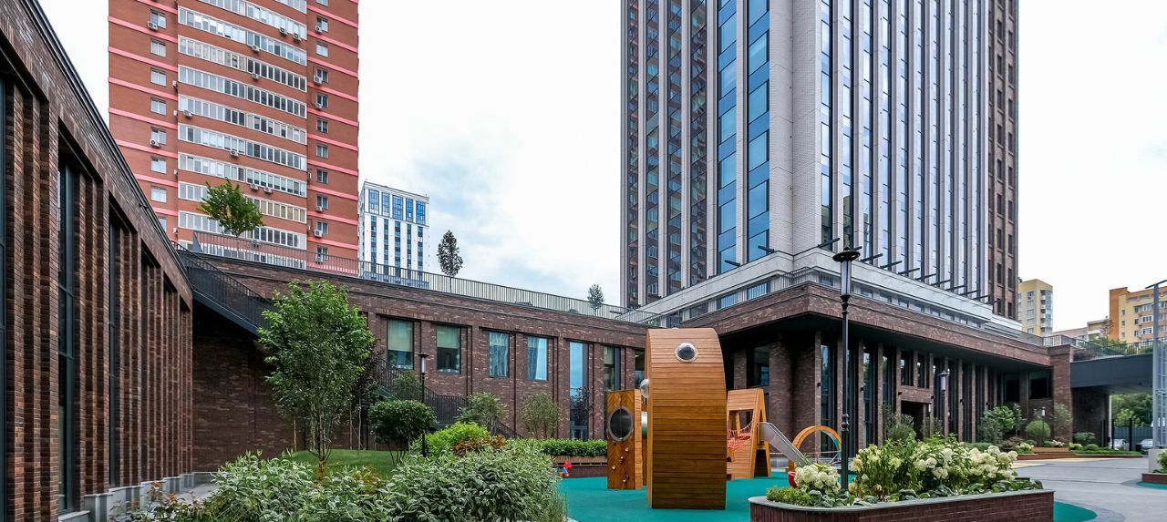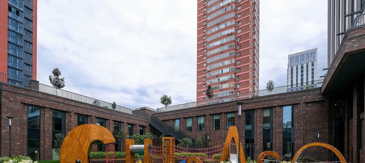 Двухуровневая дворовая территория скрыта от посторонних глаз и находится под видеонаблюдением. На верхнем уровне предусмотрено размещение террасы для отдыха и работы, а также воркаут-зона с уличными тренажерами. Нижний уровень располагается в центре двора между башнями и административным блоком. Площадка 24 м на 12 м содержит детский игровой комплекс премиум-класса KOMPAN и зону для активных спортивных игр.