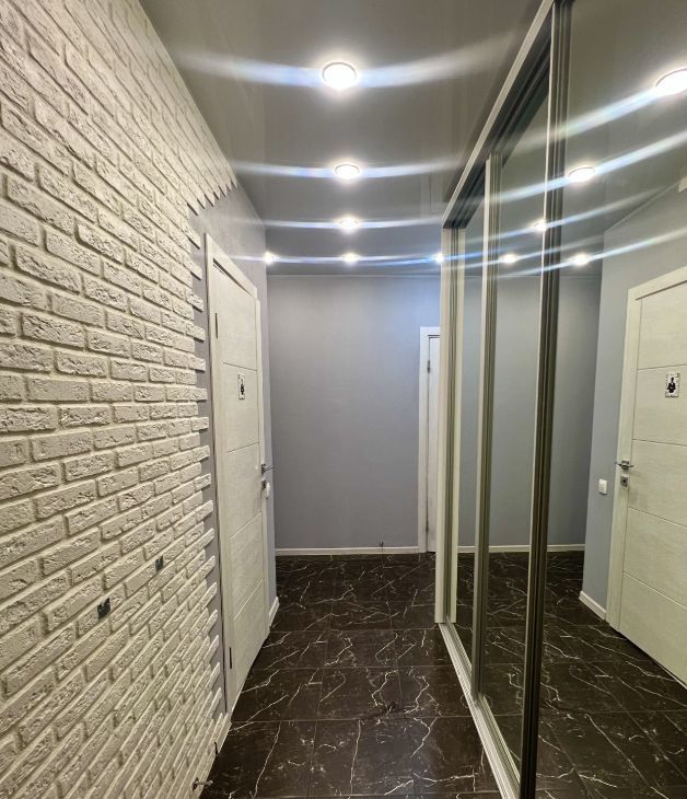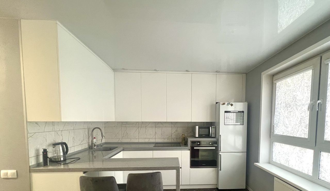В квартире выполнен качественный евроремонт. Комнаты обставлены мебелью, создавая уют и комфорт. На кухне есть современная мебель и техника, включая холодильник и посудомоечную машину.