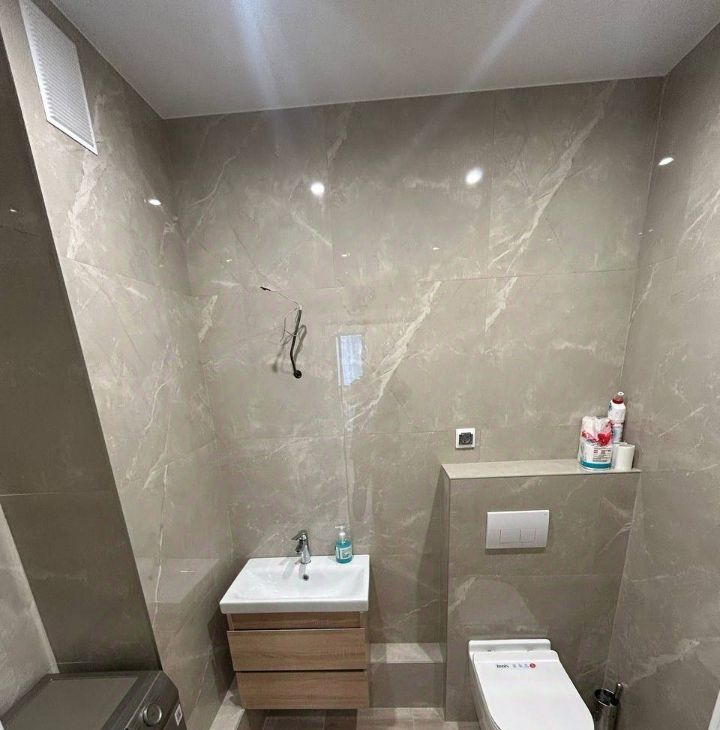 Современный санузел — плитка под мрамор, унитаз с биде, раковина с тумбой, всё новое и чистое