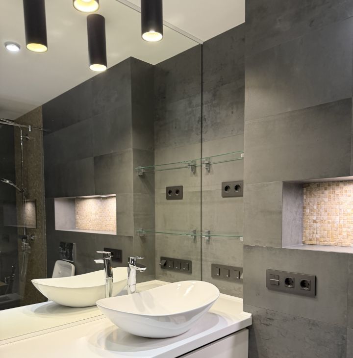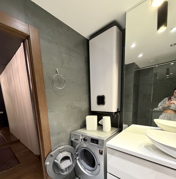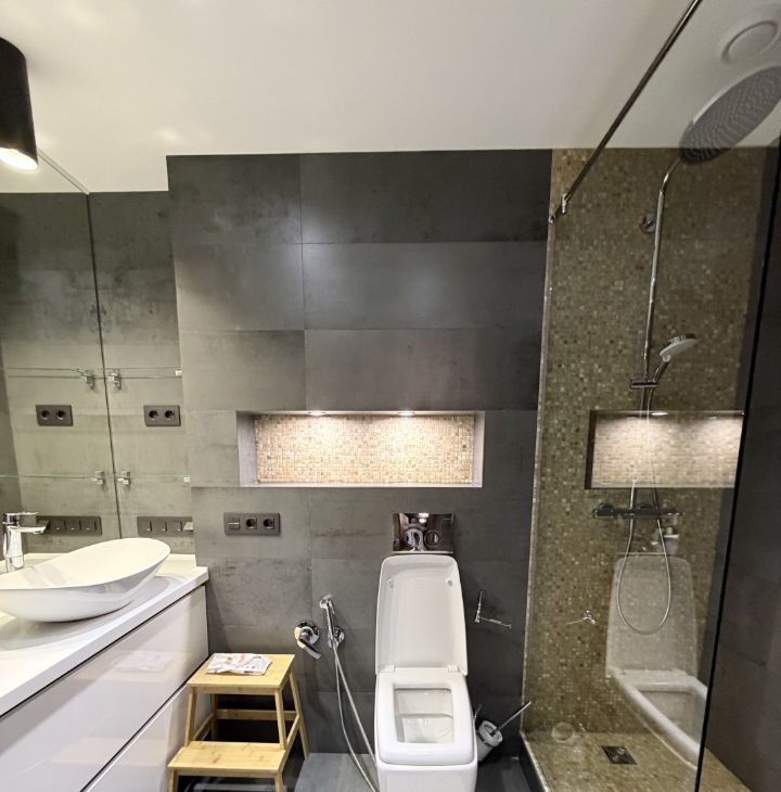 санузел: зона душевой выполнена мозаикой из натурального оникса, испанский керамогранит , дорогая сантехника , смесители Grohe, водонагреватель на 100л, большая стиральная машина с сушкой, гигиенический душ