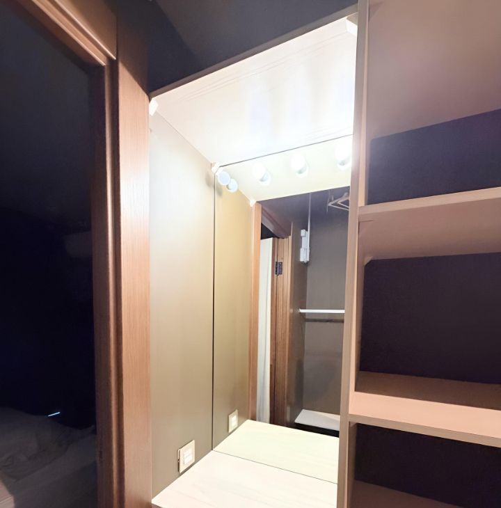 из спальни вход в просторный гардероб с зонами хранения и туалетным столиком с зеркалом