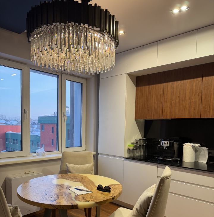 дизайнерские стулья и большая люстра