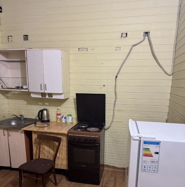 В квартире холодная вода, для нагрева волы стоит боллер, есть ванна с душем, плита, холодильник, один диван, раскладушка.