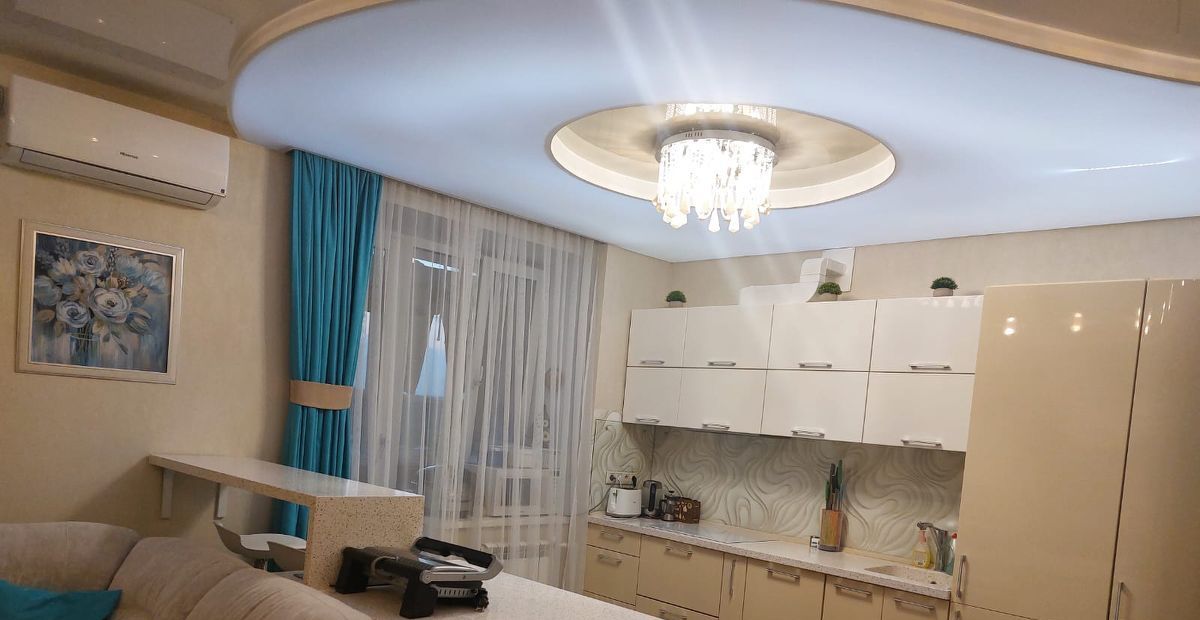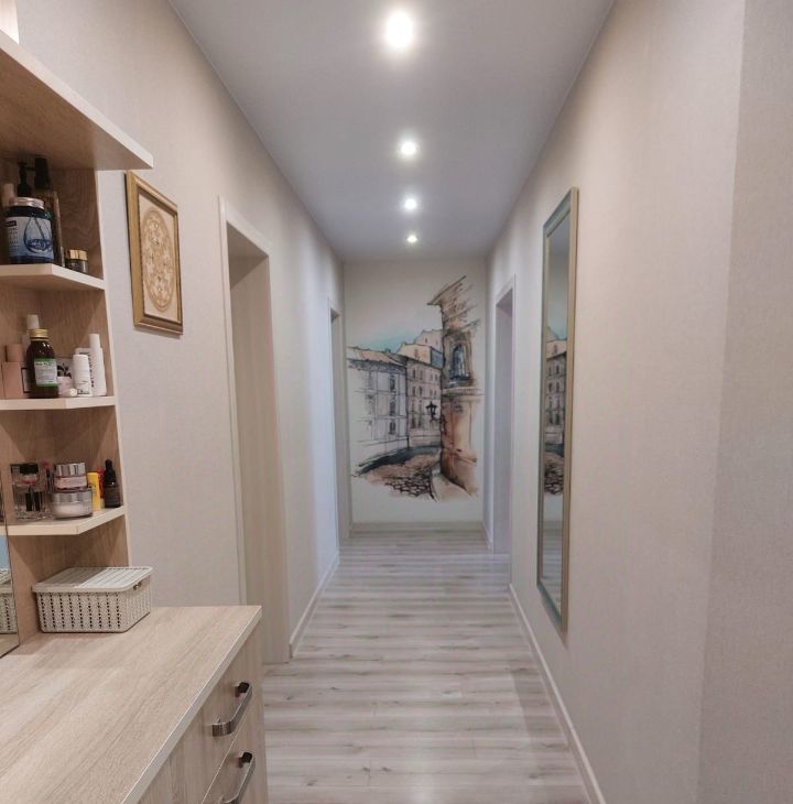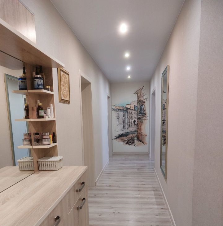 Квартира выполнена в формате евро-трёшки: кухня объединена с гостиной, создавая просторную зону ~30 м². Перепланировка полностью узаконена, все документы на руках. При желании стену можно восстановить — это не потребует серьёзных вложений. Имеется 3 лоджии (в том числе на кухне).