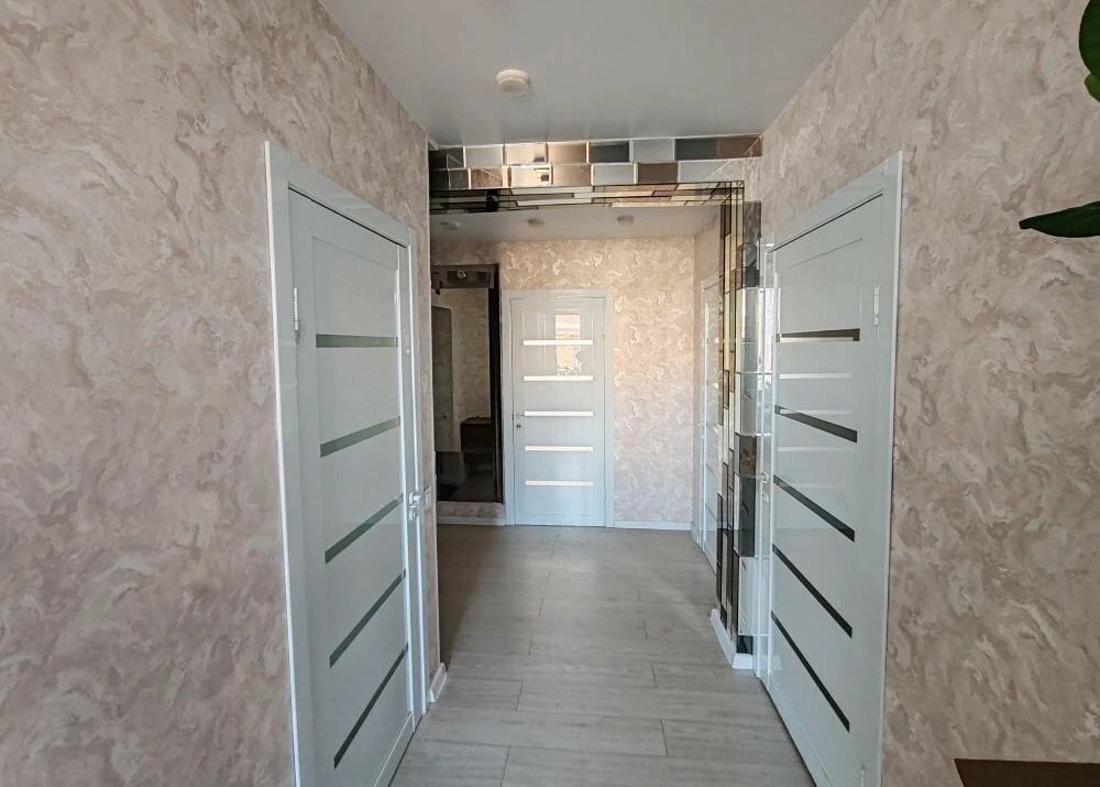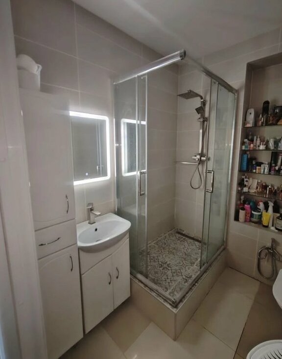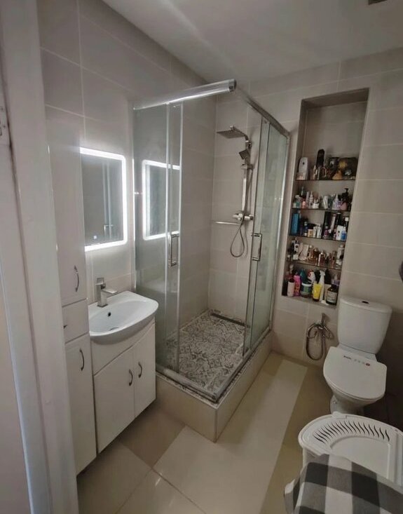 Ванная комната совмещенная, оформлена кафелем в светлых тонах и оснащена душевой кабиной. В коридоре предусмотрены вместительные шкафы для хранения вещей.