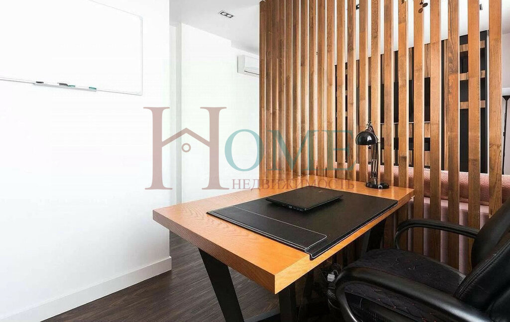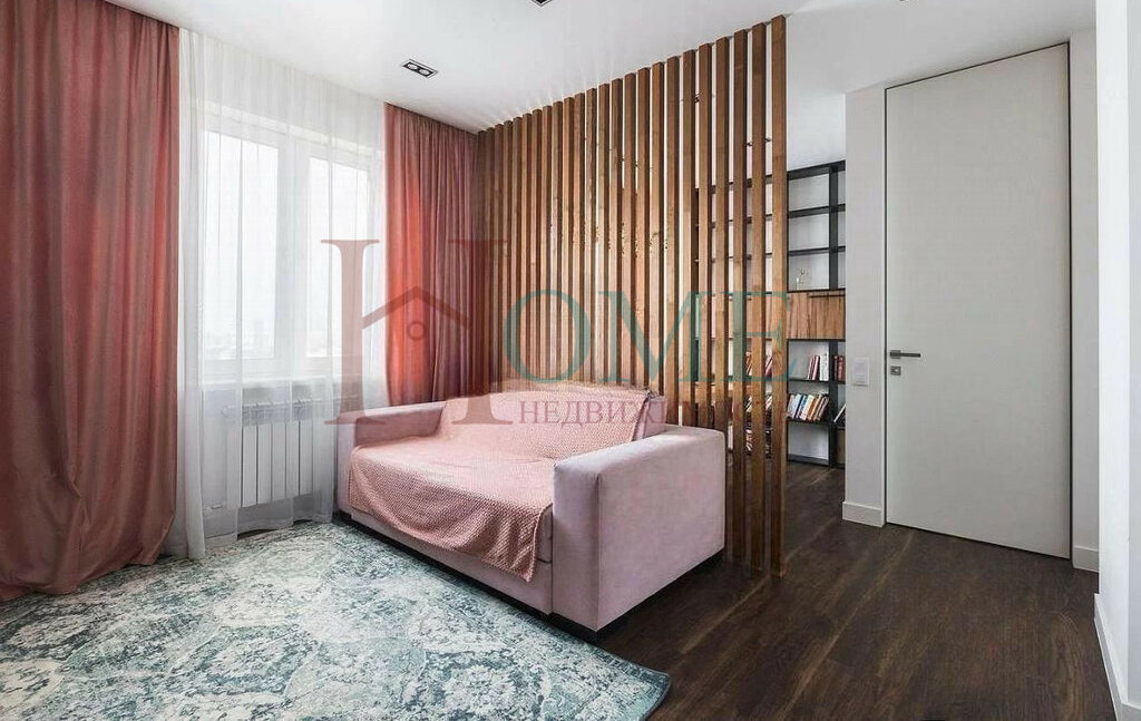 • Гостиная 18.7 м² имеет реечную перегородку, разделяя зону отдыха с рабочей зоной, телевизор, два окна