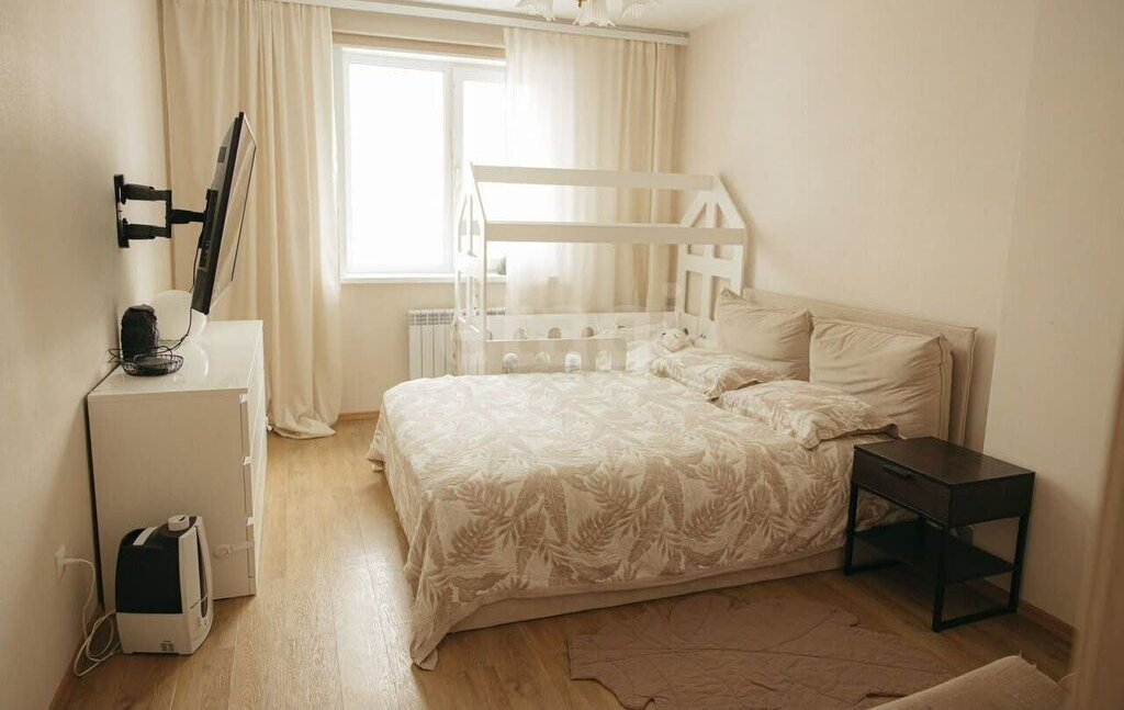 2. Спальня. Остаётся всё, что на фото. Большой кайфовый телик, приставка, две тумбы, детская кровать. На окне рулонная блэкаут штора. Спать одно удовольствие. Удобный мягкий матрас. Детскую кровать при необходимости уберём.