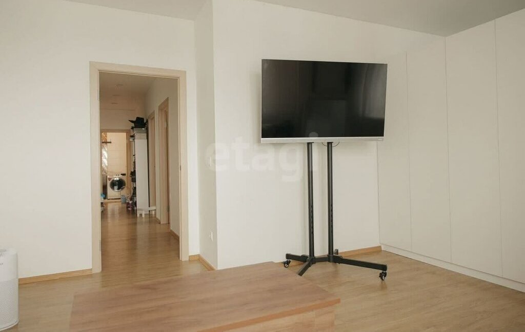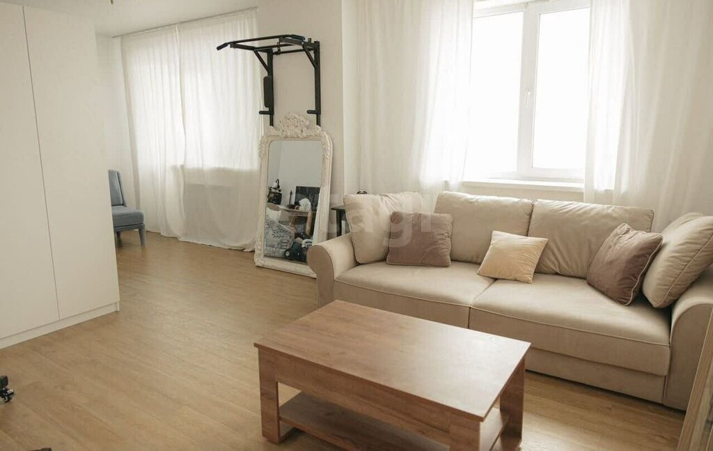 3. Зал-кабинет. Большая комната для встреч с друзьями или комфортной работы. Отделили шкафом рабочую зону, чтобы никто не мешал. Рядом на стене турник. Напротив дивана большой качественный телик с подключением к интернету.