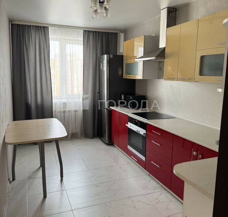 Квартира с качественным евроремонтом, есть мебель на кухне, а также необходимая техника: холодильник и стиральная машина. Планировка включает три комнаты и один балкон. Санузел раздельный, в ванной комнате установлена ванна.