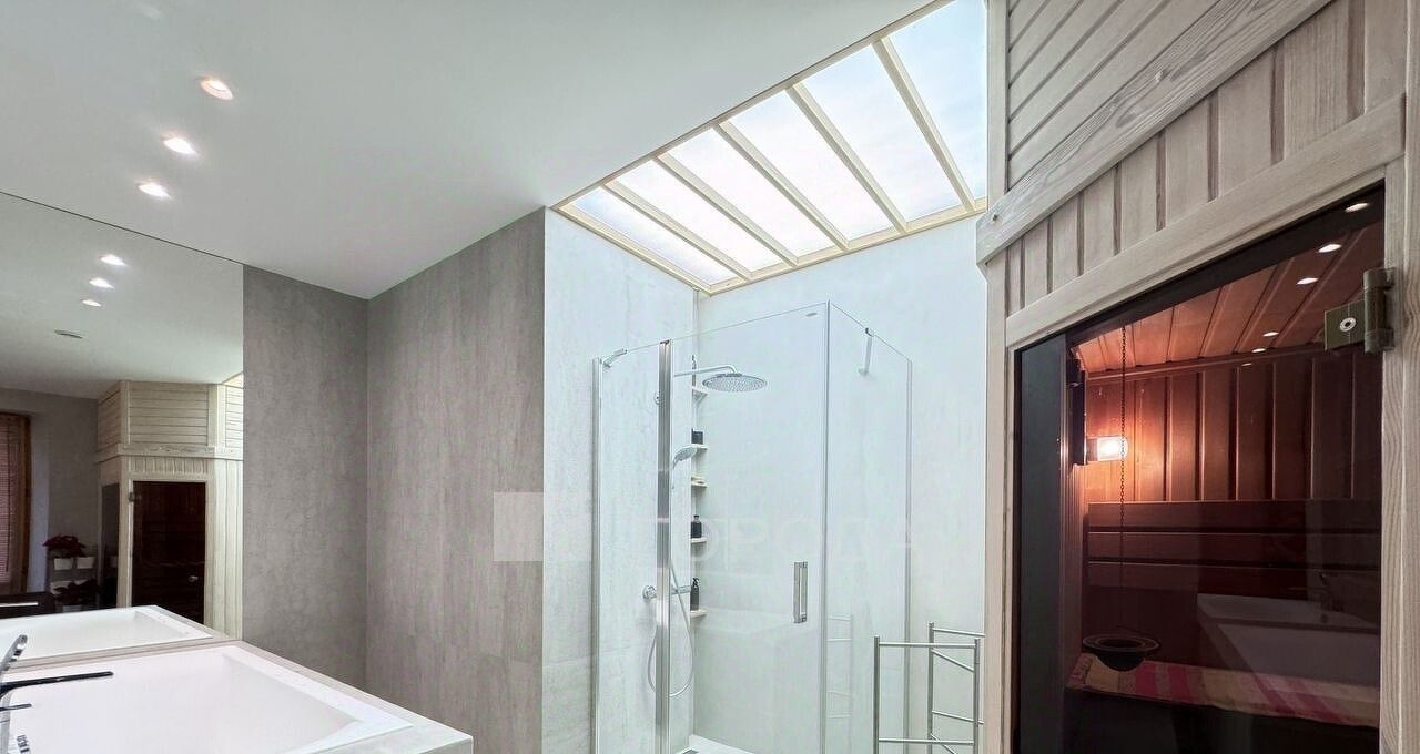 Есть застекленная душевая кабина и большая ванна, отдельный туалет, стиральная машина с функцией сушки.