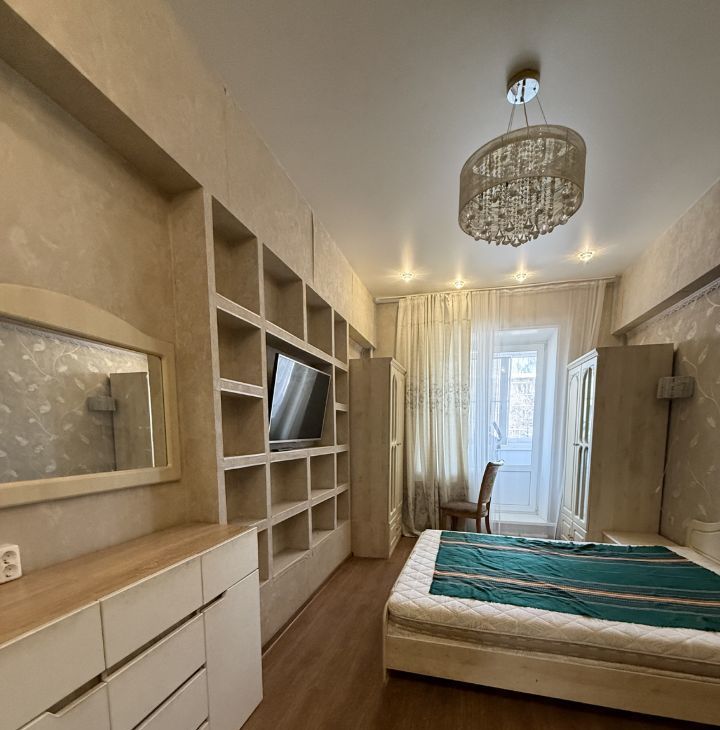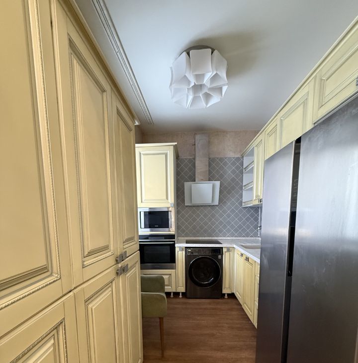 В квартире сделан евроремонт. Комнаты светлые и уютные, окна выходят как на улицу, так и во двор. Есть два балкона. На кухне площадью 5 кв. м установлена современная мебель и вся необходимая техника: холодильник, посудомоечная и стиральная машины. В ванной комнате — удобная ванна.