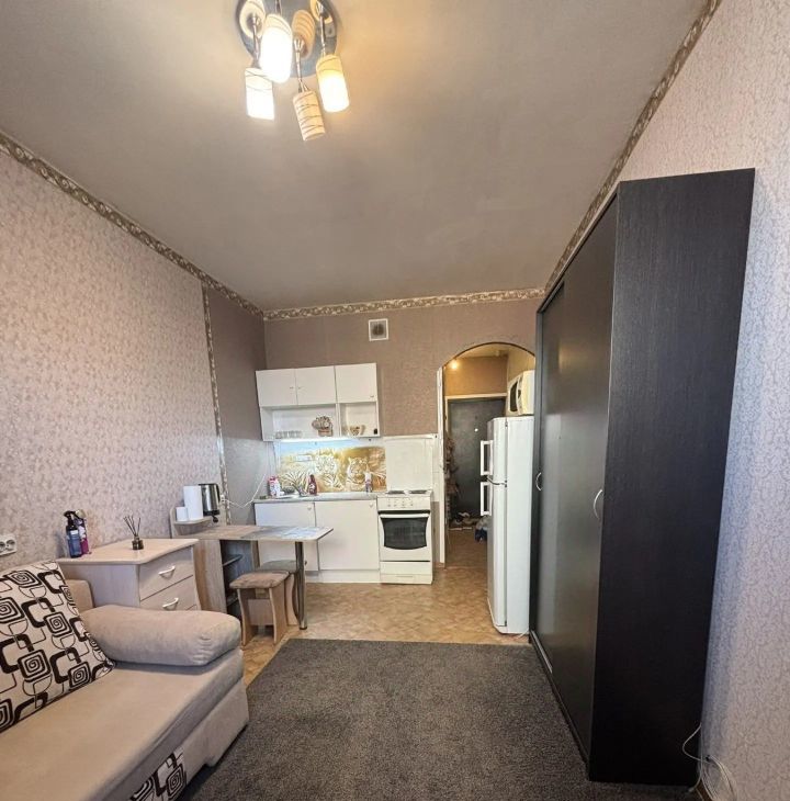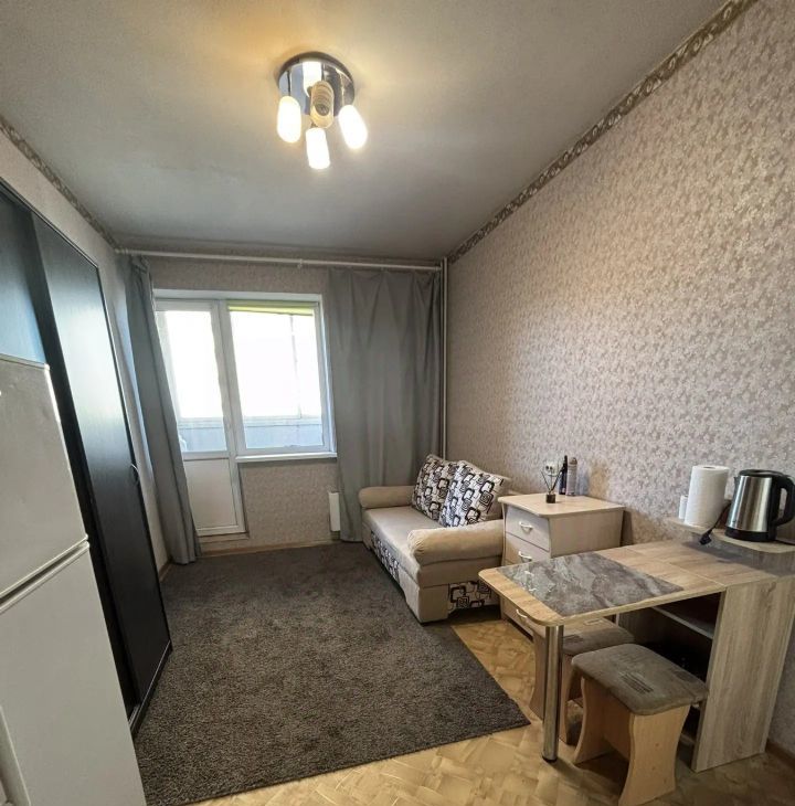 Сдаётся уютная квартира-студия,косметический ремонт. Есть всё для комфортного проживания.Кухонный гарнитур,холодильник,микроволновка,стиральная машинка,чайник,диван новый.В шаговой доступности школа,дет.сады,магазины.Перед домой большая стоянка для автомобилей. Для лифта,консьерж.На длительный срок..
