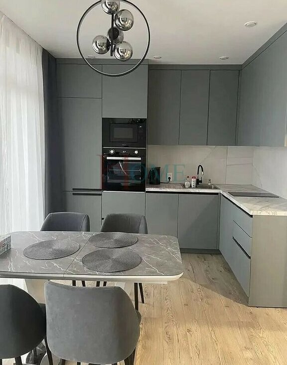 Кухня оборудована встроенной техникой, включая духовой шкаф и микроволновую печь.
