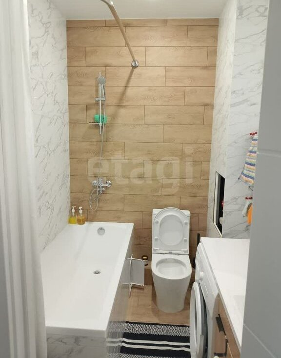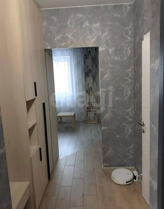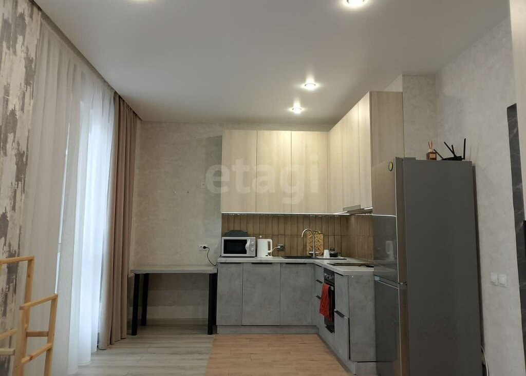 В квартире есть все необходимое для комфортного проживания: кухонная и комнатная мебель, холодильник, микроволновка, индукционная варочная плита, большой диван, стиральная машина. Санузел совмещенный, оборудован ванной, унитазом, раковиной с большим зеркалом. Все выполнено в современном стиле, что создает уютную атмосферу. В доме работают два лифта — пассажирский и грузовой, а также предусмотрен пандус для удобства.