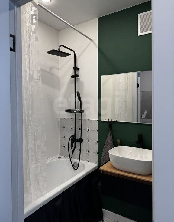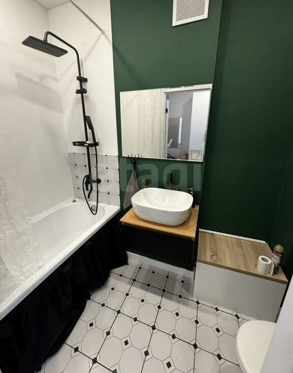 Совмещенный санузел выполнен в современном стиле с освежающими зелеными акцентами. Из окон открывается живописный вид на город и реку, который будет радовать вас каждый день.