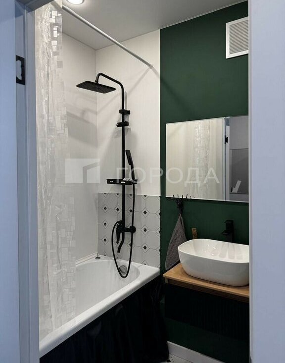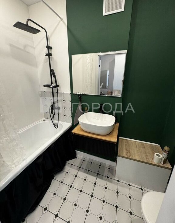-Санузел совмещенный, оформлен в современном стиле с акцентом на зеленые оттенки.