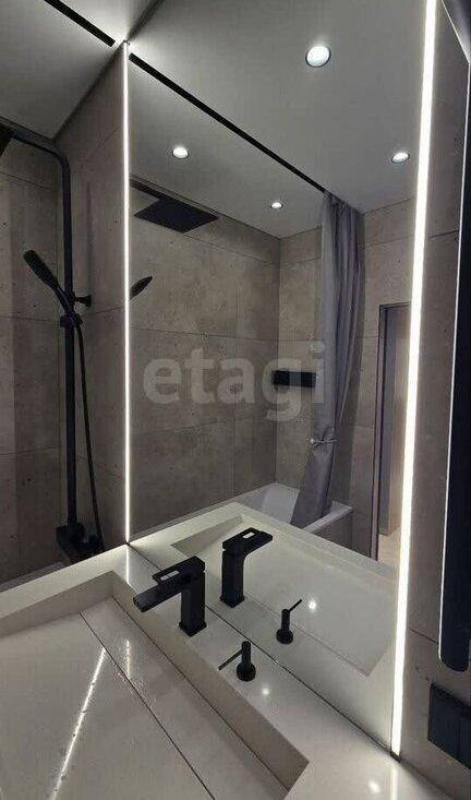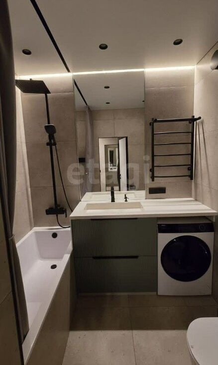 Совмещенный санузел оборудован ванной с тропическим душем и качественной сантехникой. Уложен широкоформатный керамогранит, 3 сценария освещения: релакс с тёплым светом, яркое белое на зеркале в потолок для личной гигиены. Есть фен, электрический полотенцесушитель, стирально-сушильная машина. Бойлер, датчики от протечки. Вместительная тумба для хранения. Ванна из литиевого мрамора, раковина и столешница из искусственного камня.