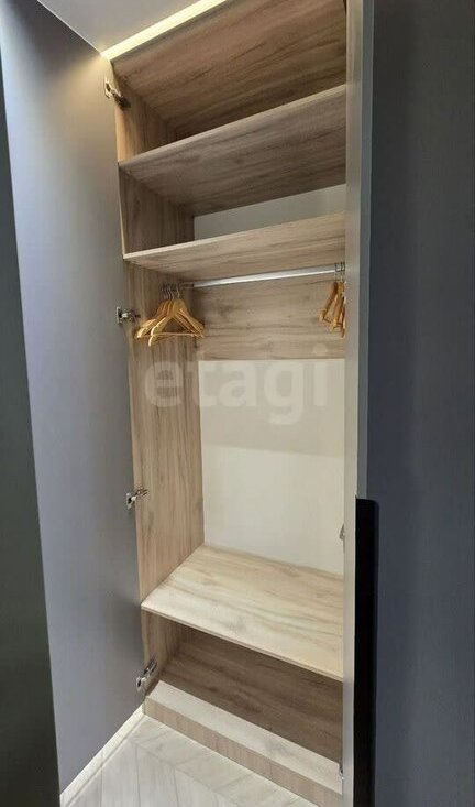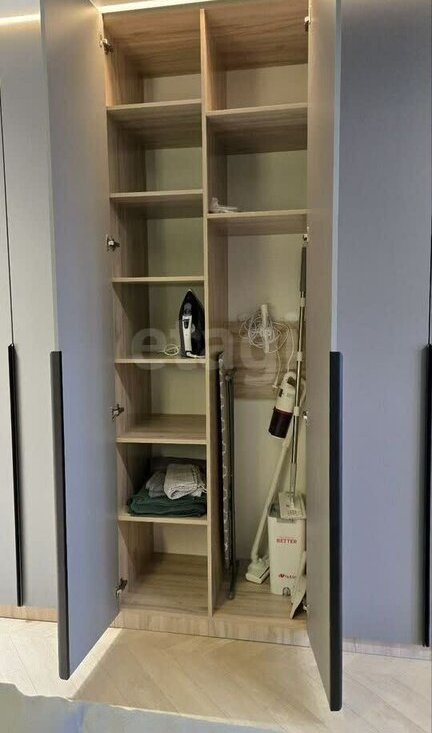 Возле кровати расположена система хранения длинной 3 метра от пола до потолка. Влезут все необходимые вещи. Есть пылесос, гладильная доска утюг и необходимые для повседневной уборки инвентарь.