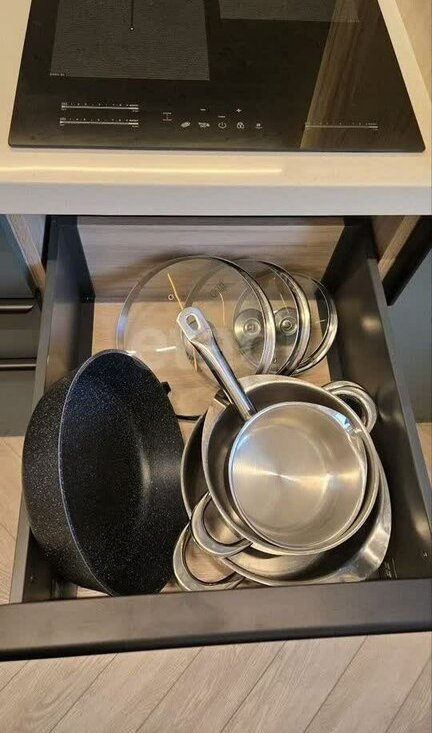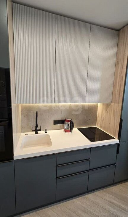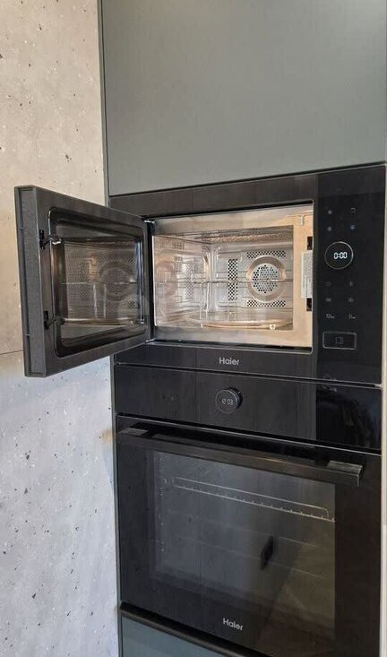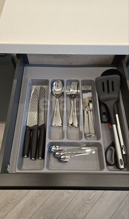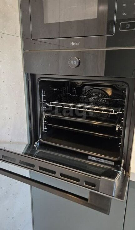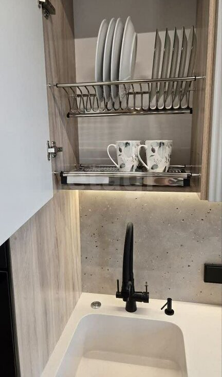 Кухня, оснащена посудомоечной машиной, духовкой, встраиваемой микроволновкой, измельчителем, датчиком от протечки, индукционной плитой, встраиваемой вытяжкой, встраиваемым холодильником. Столешница и раковина из искусственного камня. Также есть новый столовый набор, посуда, кастрюли сковорода, необходимая для готовки мелочь.