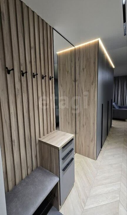 Прихожая встречает зеркалом от пола до потолка. Просторно, есть куда поставить вещи, повесить одежду с удобством снять обувь.