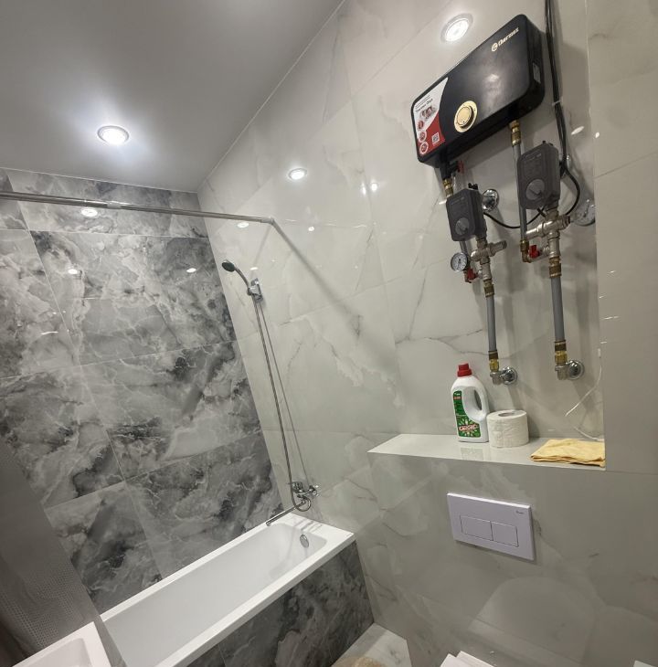 В квартире выполнен свежий евро ремонт. Просторная кухня оснащена необходимой техникой: холодильник, плита, микроволновая печь и духовка. Из мебели — шкаф и диван. Санузел совмещенный, оформлен в современном стиле с качественной сантехникой.