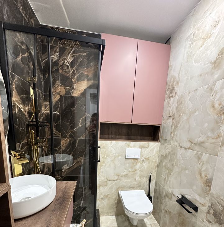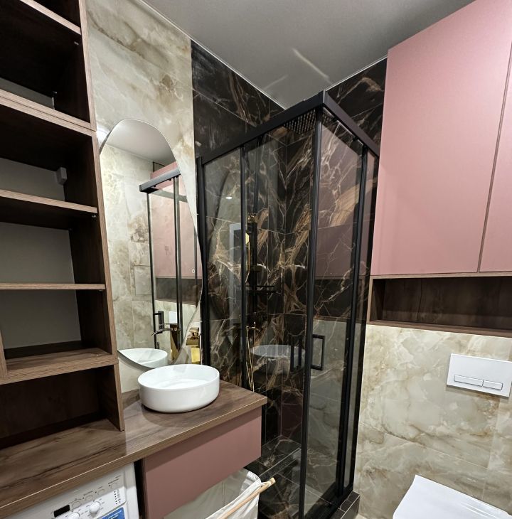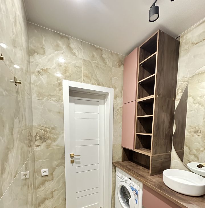 В ванной много места для хранения, и стиральная машинка.