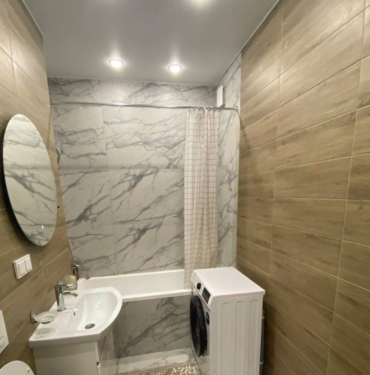 Ванная комната: Совмещенная, в светлом кафеле, с полноценной ванной и стиральной машиной.