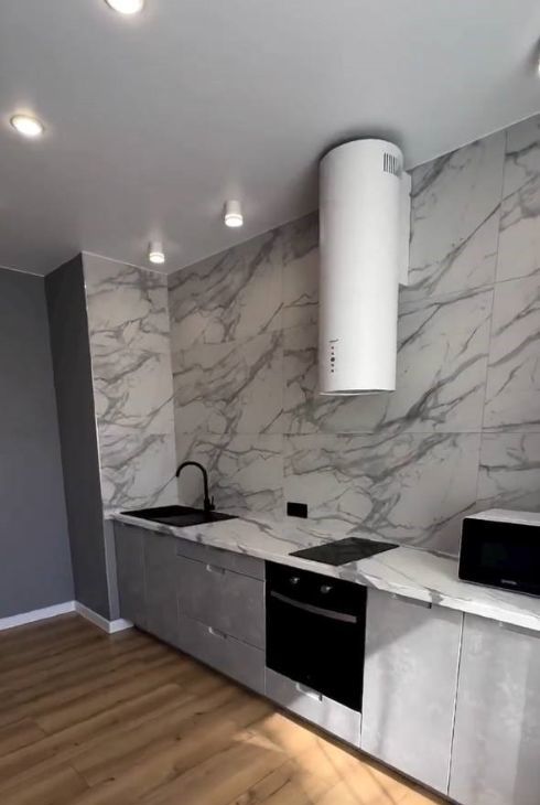 Кухня: Элегантный гарнитур под мрамор.