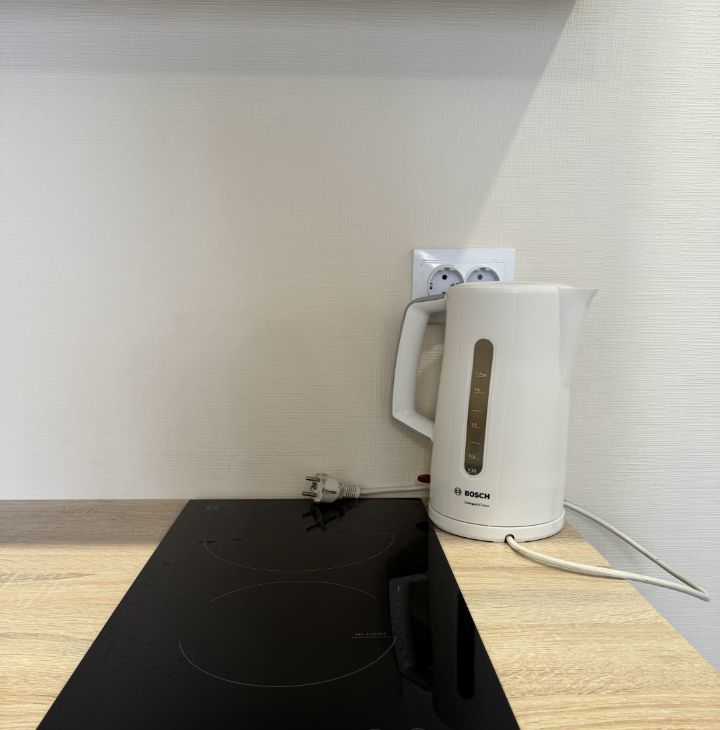 Имеется все необходимое для долгосрочного проживания: плита электрическая, стиральная машинка, холодильник, микроволновая печь, чайник, шкаф, раскладной диван, стол, стулья.