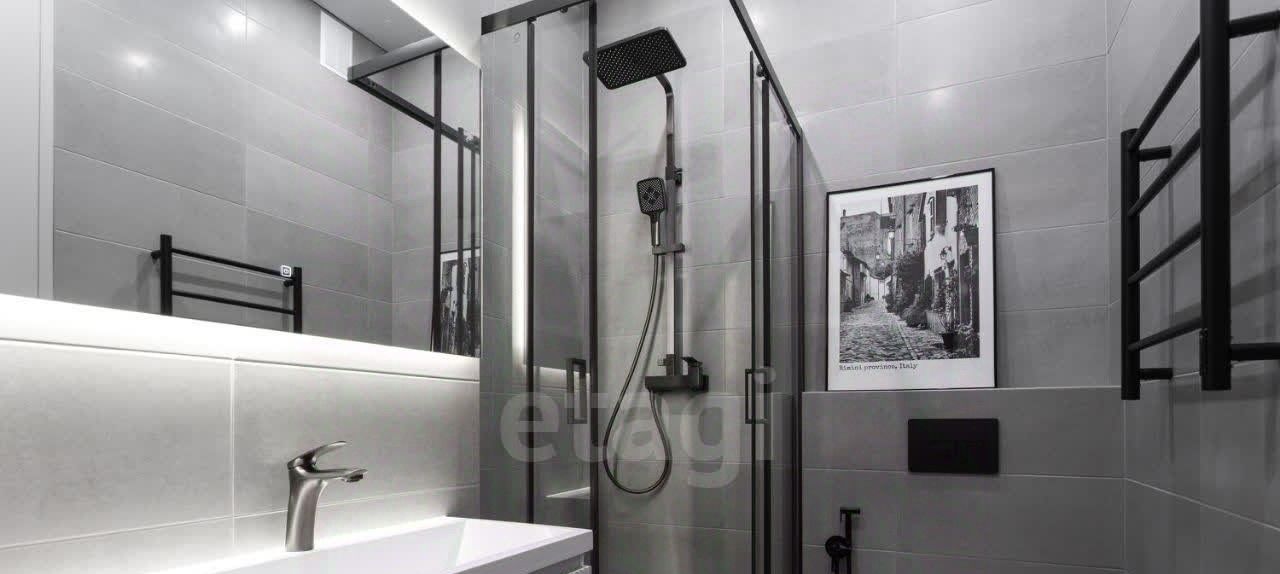 Современная ванная комната: Просторная душевая кабина, стильная сантехника и шкаф для хранения.
