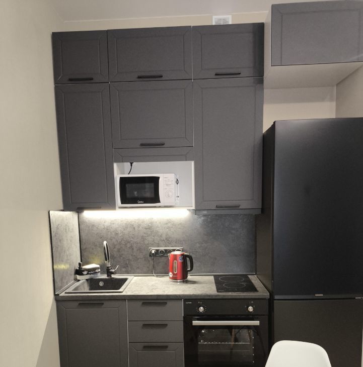 Интерьер студии продуман с учётом максимального комфорта: к Вашим услугам диван с полноценными двумя спальными местами, постельное белье и полотенца, фен, вместительный шкаф, гладильная доска и утюг, сушилка для белья, плечики, необходимые столовые приборы, набор посуды, современная техника (Smаrt-ТV с подписками Wink и Кинопоиск, Wi-Fi (200 Мбит/с), холодильник, плита, духовой шкаф, стиральная машина, микроволновая печь, кондиционер), полный набор аксессуаров для дома и бытовой химии. На случай отключения горячей воды предусмотрен водонагреватель.