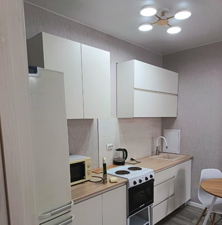 В квартире сделан свежий евроремонт. Обстановка включает удобную мебель как на кухне, так и в комнате. Из техники есть всё необходимое: холодильник, телевизор, стиральная машина. Комфортный санузел совмещён и оборудован ванной, что позволяет расслабиться после рабочего дня. Квартира располагает балконом, где можно наслаждаться свежим воздухом.