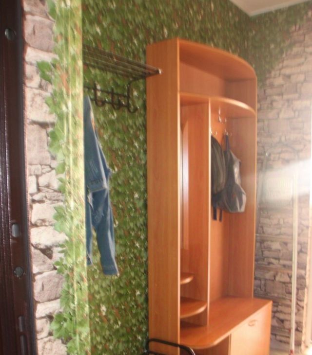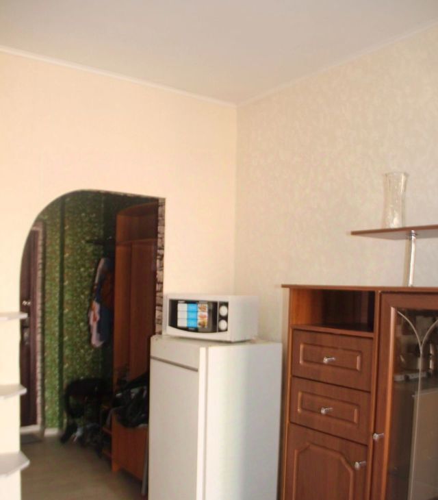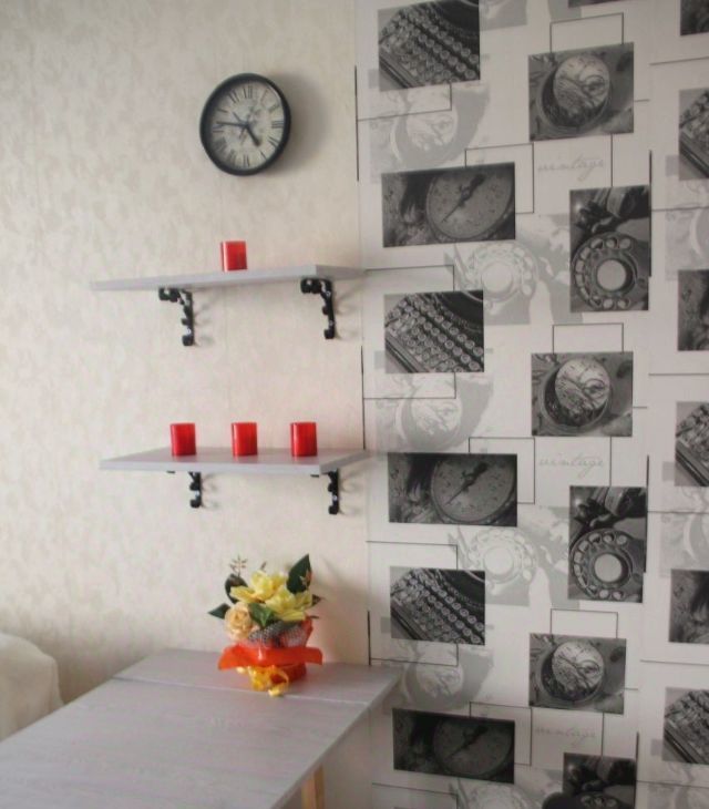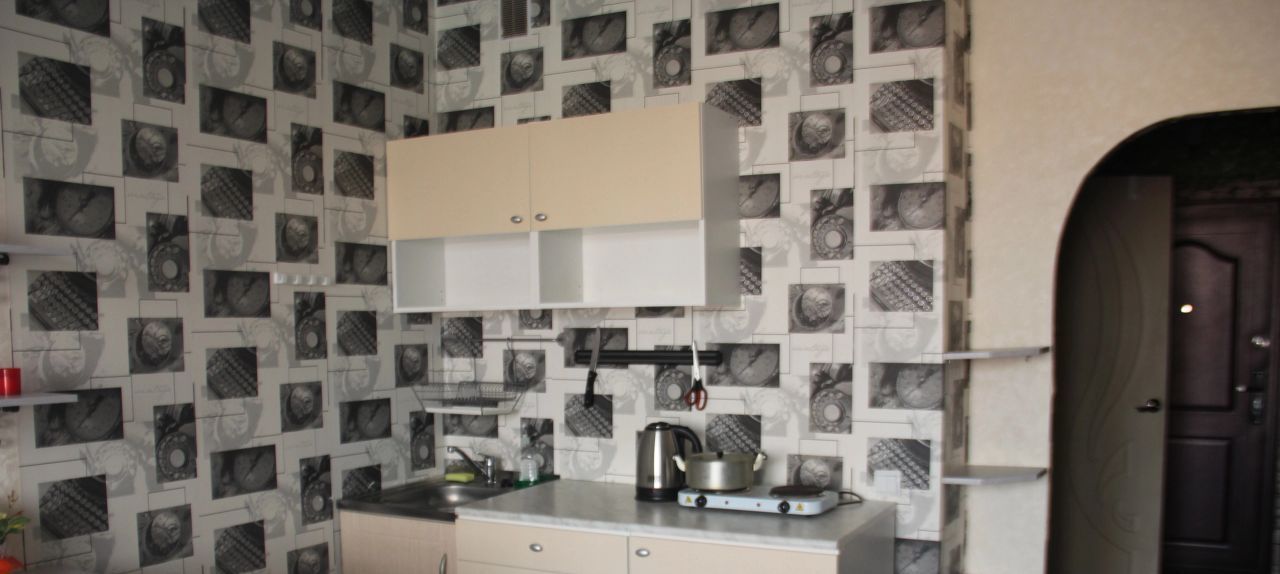 Обои на фото старые. Сейчас там новые. Есть печка, микроволновка, чайник и телевизор.