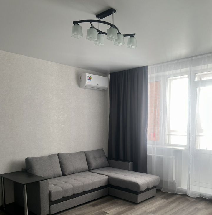 В гостиной установлен кондиционер, телевизор и удобный диван. Из мебели также имеются шкафы.
